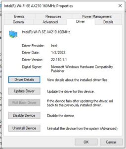Check the wireless driver version by running “Device Manager”, opening “Network adapters”, locating the “Intel Wi-Fi 6E AX210 160Mhz” device, left-clicking on it and selecting Properties, open the Driver tab, and look for “Driver Version”.